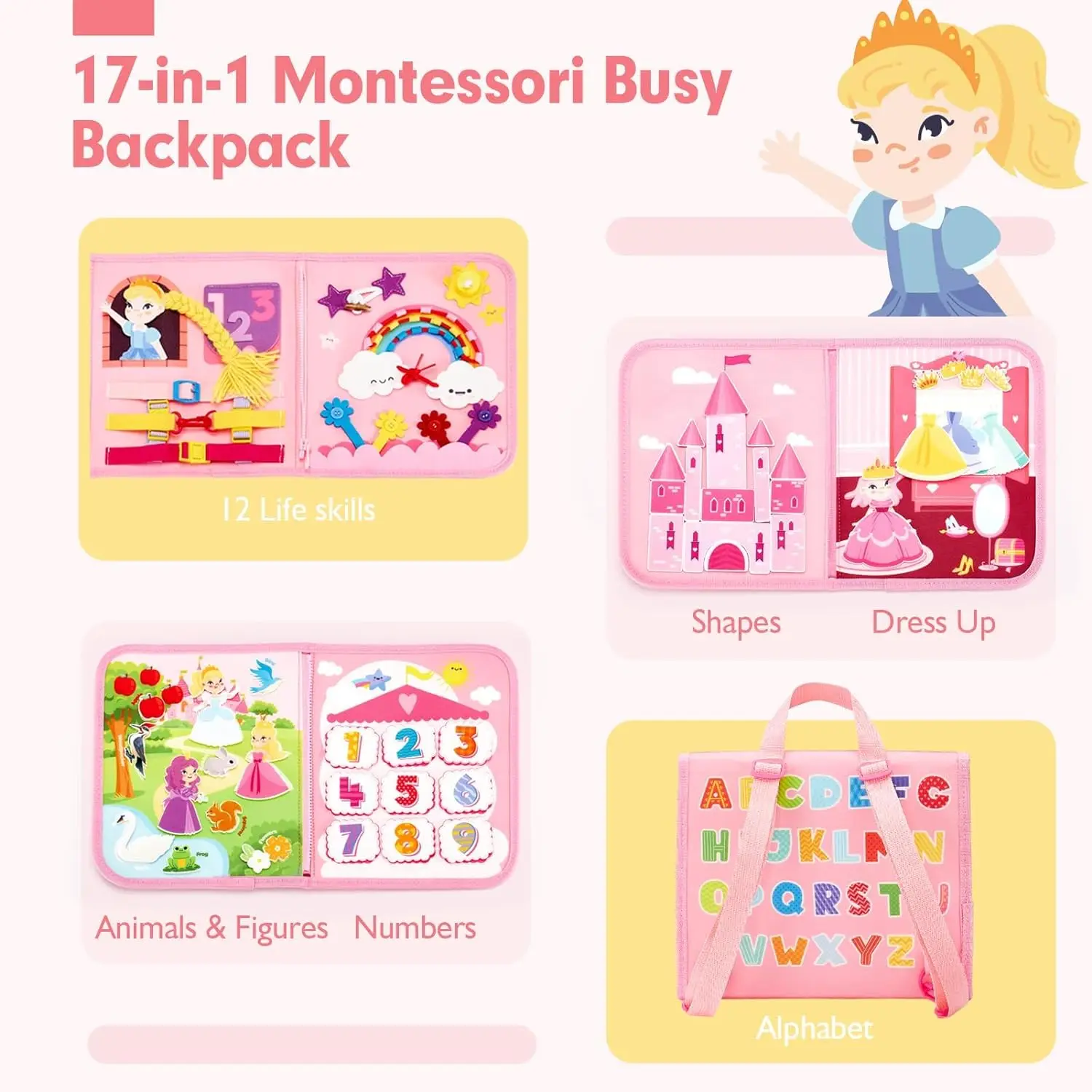 • 【Preschool Learning Activities】Embrace a world of learning with our Montessori Busy Backpack, designed for curious minds . This princess-themed treasure trove combines essential life skills with a rich variety of cognitive challenges, including numbers, shapes, dress-up, and more. Perfect for developing hand-eye coordination, problem-solving, and logical thinking, Our toys for todders will give your baby an enjoyable learning experience.
